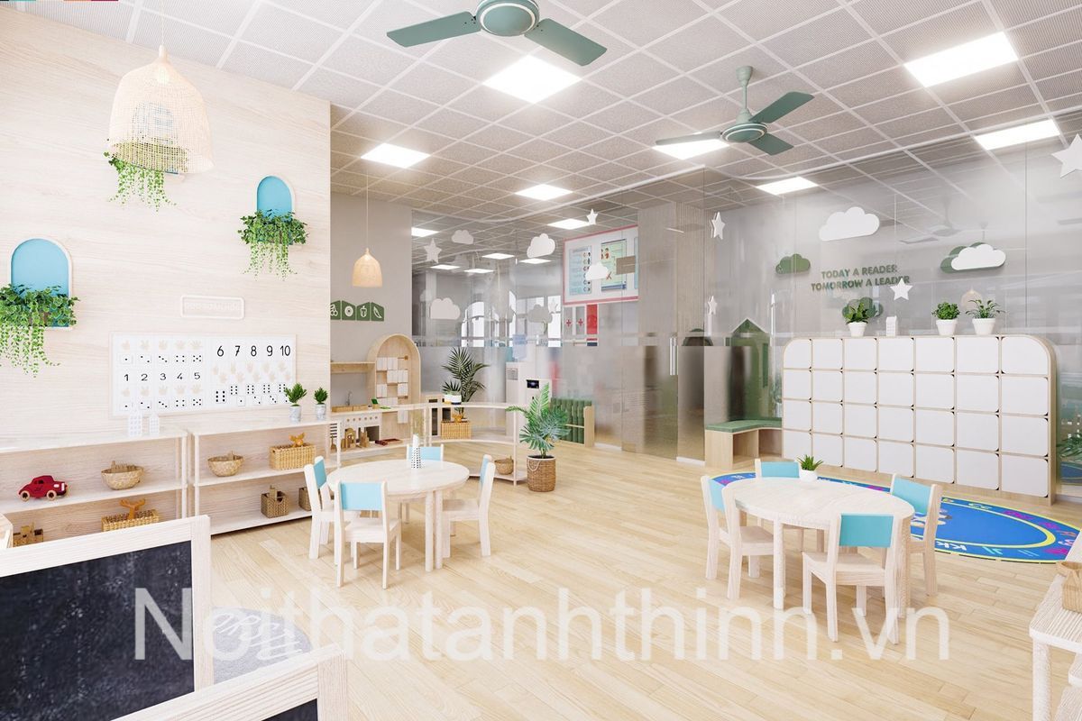 Một thiết kế nội thất trường mầm non đạt chuẩn không chỉ dừng lại ở trang thiết bị tiện nghi với vật liệu an toàn cho sức khỏe của bé. Nó còn thể hiện qua cách phân chia khu vực chức năng khoa học cùng kiểu bày trí đồ đạc hợp lý. Không gian mang tính giáo dục như lớp học, thư viện, phòng máy tính cũng như khu vực vui chơi cần được đầu tư chỉn chu.
